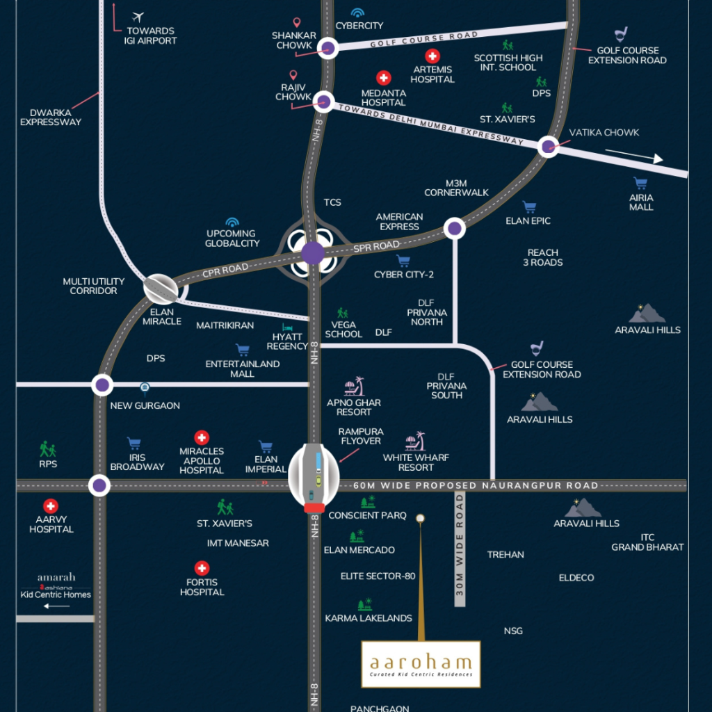 Ashiana Aaroham is located in Sector 80, Gurugram (Gurgaon) — a prime residential area with excellent connectivity to NH-8, Dwarka Expressway, SPR, and KMP Expressway, surrounded by schools, hospitals, and lifestyle hubs.